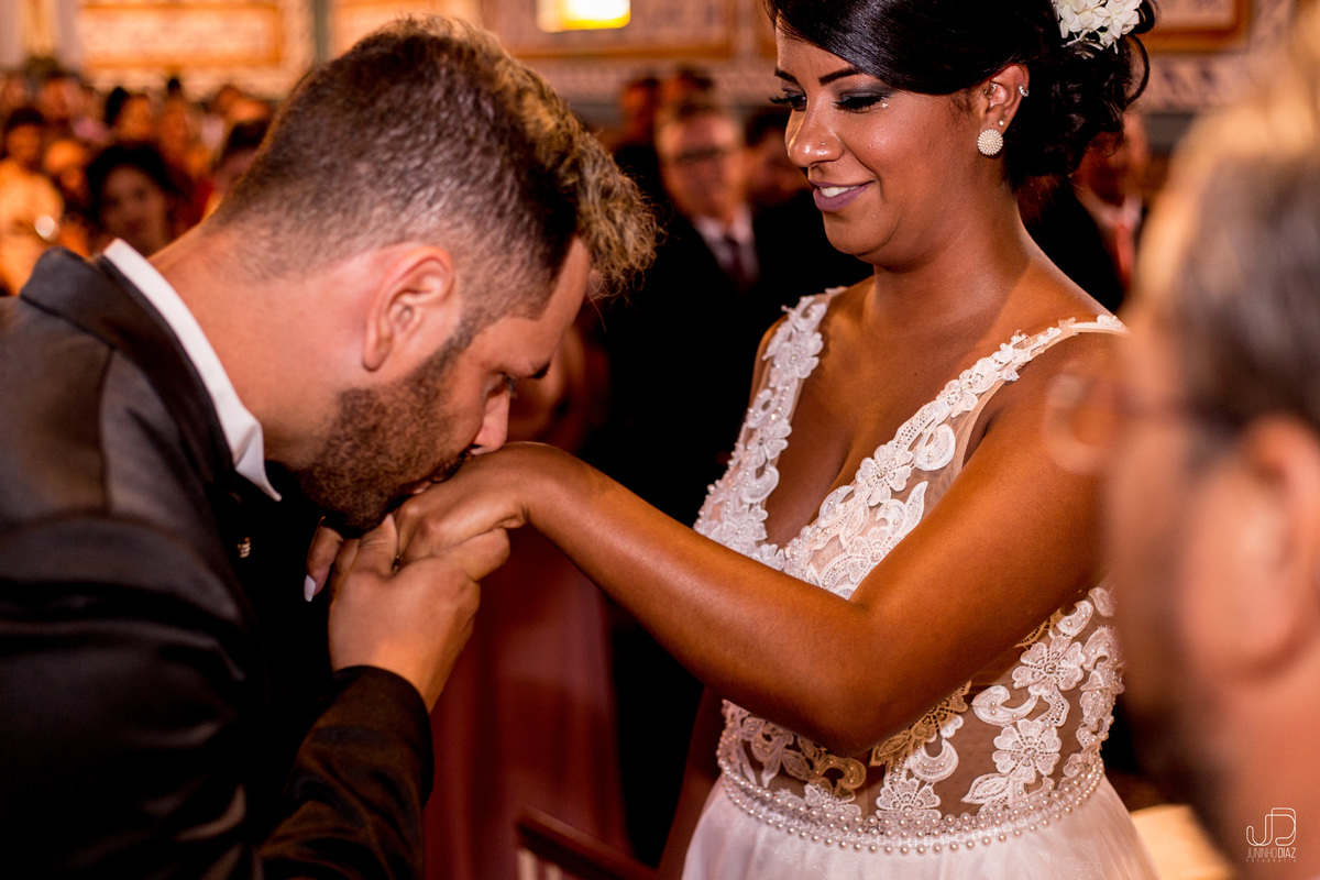 CASAMENTO Jau/SP 16/Dezembro/2017 BEATRIZ E MARCELO 10052 visualizações 95 curtidas noivo abraçando noiva na igreja sorrindo no click do fotógrafo de casamento de Jaú Juninho Diaz com a igreja de fundo e os bancos vermelhos contrastando com a imagem